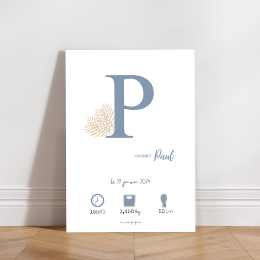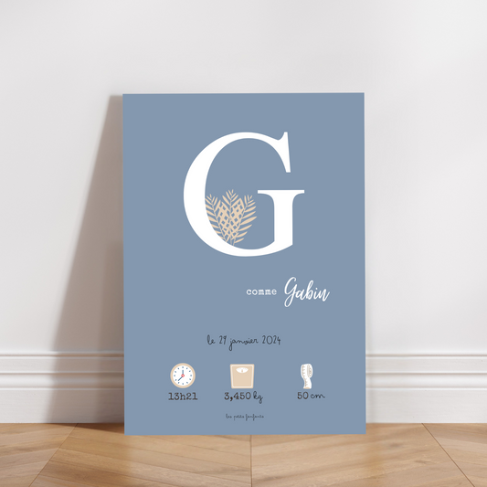 Affiche naissance personnalisée - Bleu gris sur fond blanc