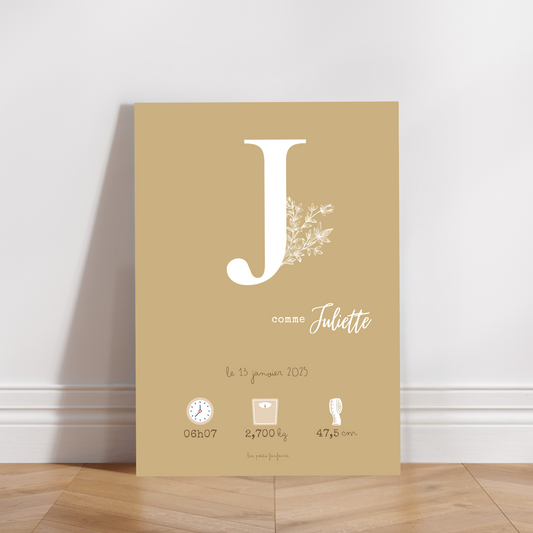 Affiche naissance personnalisée - Ocre jaune sur fond blanc
