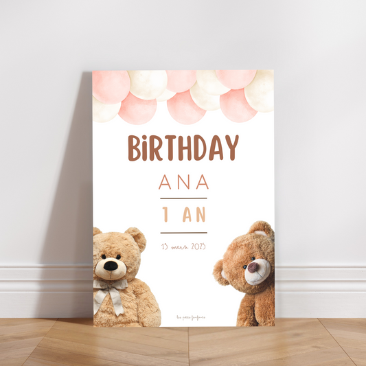 Thème Ourson version rose - Affiche anniversaire